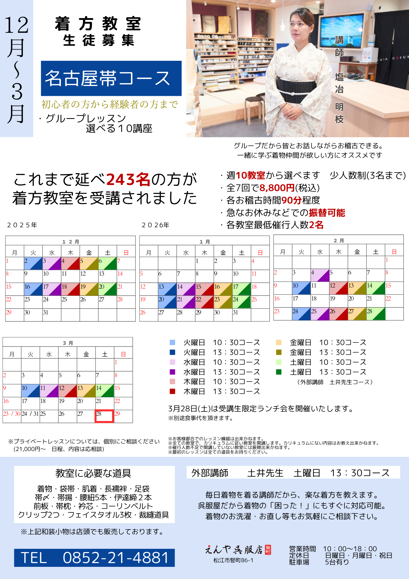 女性の着物 着方教室(着付け教室)のお稽古風景